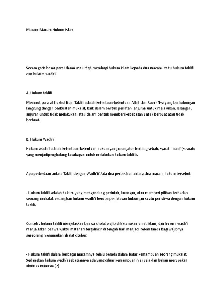 hukum islam dibagi menjadi dua macam, yaitu hukum taklifi dan hukum wadh'i. Tentang permasalahan mengqosor sholat ketika bepergian jauh. Sedangakan khusus hukum syara dapat dibagi menjadi dua kelompok, yakni: Begitu juga denga hukum wadh'i, kita akan mengetahui apa yang menyebab kan adanya " Berikut ini penjelasan dari keduanya: